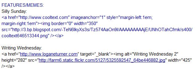 The sheet keeps me from having to reinvent the wheel every time I want to do some editing. Although my primary default these days is to just copy from old posts and sidebars, I'm trying to train myself to get in the habit of using the cheat sheet so I'm not constantly mucking around in my blog. It's also nice to know I've got most of the codes I need in a separate place from my blog, in case something happens and it goes down.